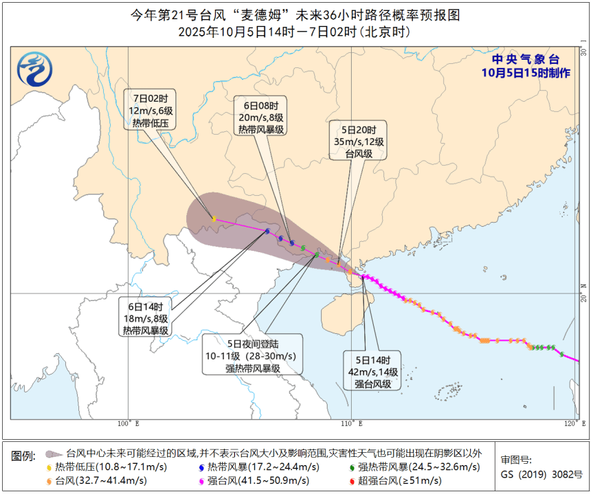 预计,受台风“麦德姆”影响,5-6日北部湾海面、桂南、桂西以及越南东北部有大雨到暴雨、局地大暴雨到特大暴雨,5日下午强降雨从桂东南开始,5日晚上到6日白天为降雨最强、范围最大时段;大风主要影响时段为5日下午至6日白天,沿海地区有8~10级、阵风11~12级大风,桂南有6~8级、阵风9~10级大风,北部湾海面风力逐渐加大到旋转风9~11级、阵风12~13级,台风中心经过的附近海域的风力有12~13级、阵风14~15级。