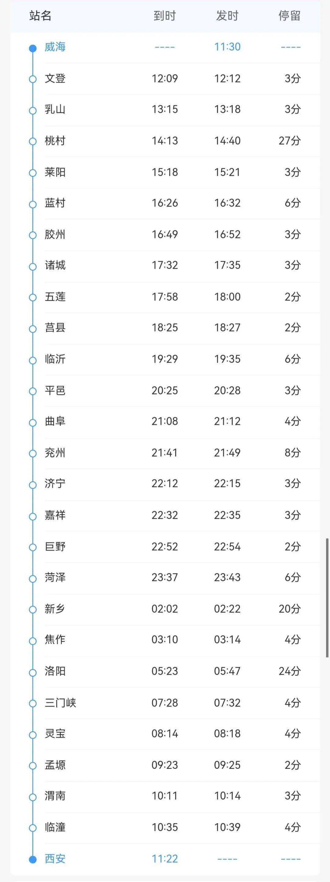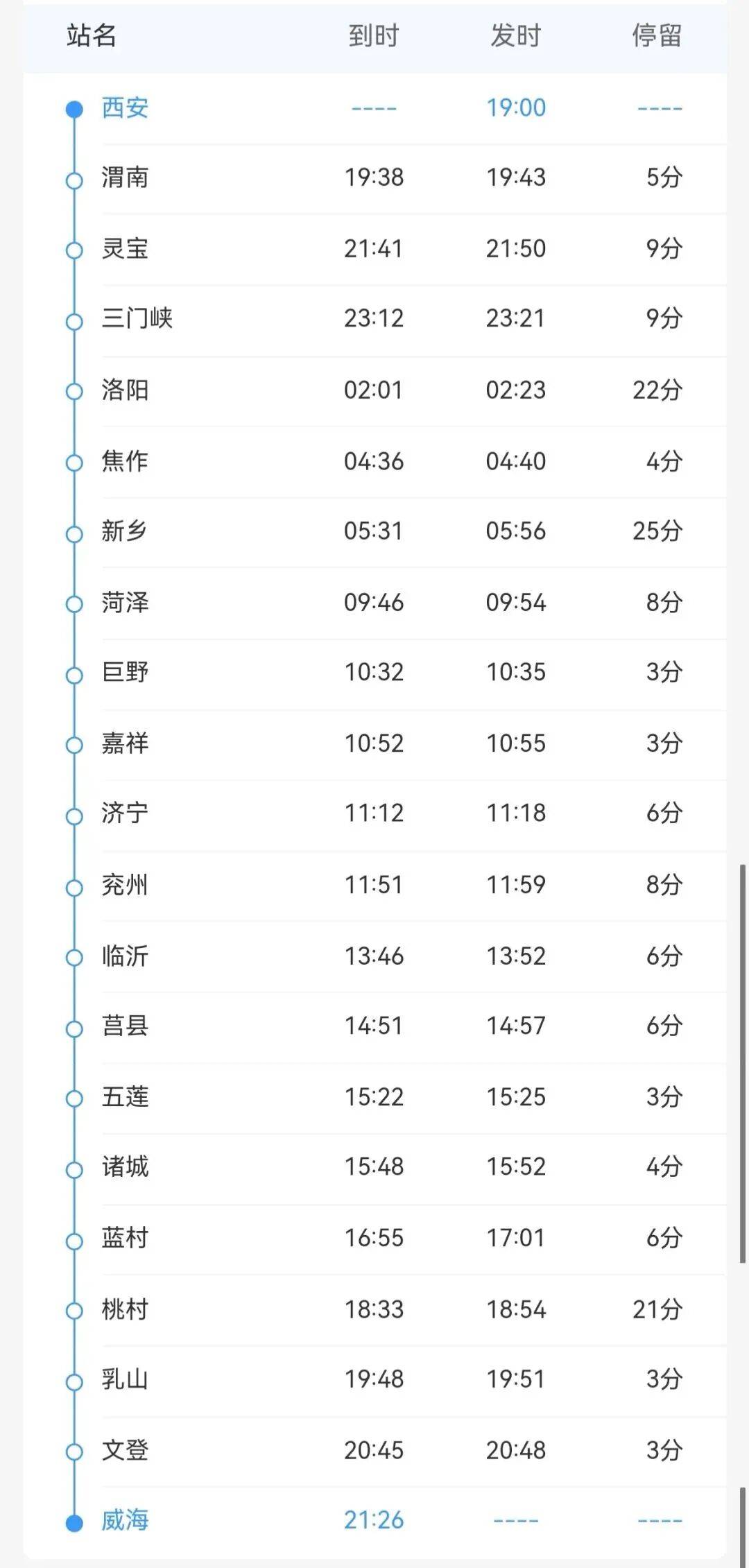 此次开通的列车串联起胶东半岛与关中平原,途经多座历史文化名城与重点县市,极大缩短了两地及沿线的时空距离。其中,威海至西安K398/5次列车于11:30从威海站始发,沿途经停文登、乳山、桃村、莱阳、莒县、临沂、曲阜、济宁、菏泽、焦作、洛阳、三门峡、灵宝、渭南、临潼等车站,全程运行平稳舒适,于次日11:22抵达西安站,让旅客在旅途中尽览沿途风光。