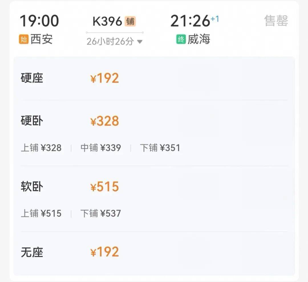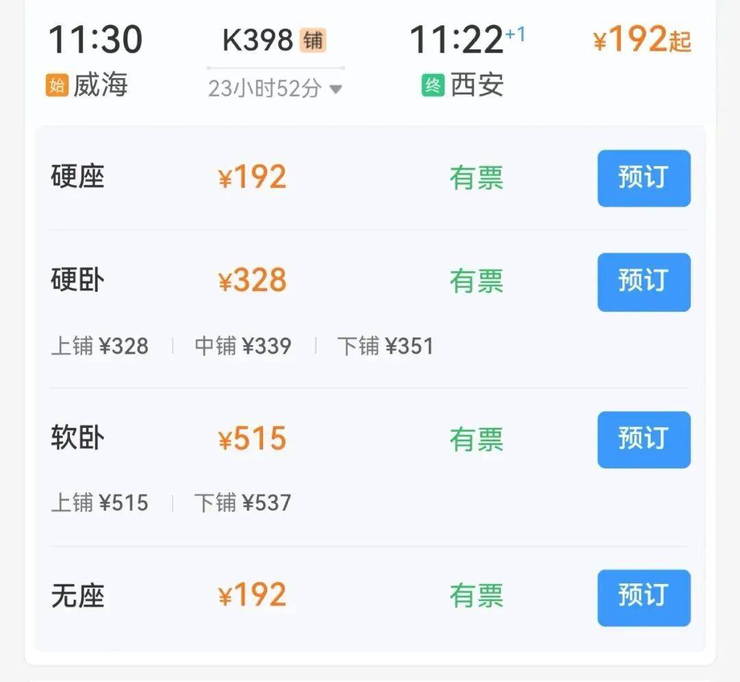 票价方面,本次开通的普速列车极具性价比优势。威海至西安全程票价为:硬座192元,硬卧上铺328元、中铺339元、下铺351元,软卧上铺515元、下铺537元。对比现有威海至西安高铁二等座票价,本次普速列车硬座票价仅为其1/4左右,极大降低了旅客的出行成本,非常适合兼顾经济性与舒适性的旅客。目前,该趟列车车票可通过12306官方网站、手机App及线下售票窗口提前预订,初期隔日开行的安排将根据客流情况适时优化调整,具体可关注铁路12306官方网站进行实时查询。