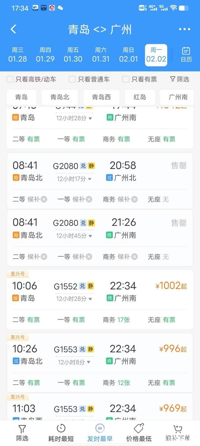 1月19日下午,记者登录铁路12306App查询发现,春运首日,青岛始发多个方向车次票源较为充足。其中,2月2日,青岛至北京方向多趟列车余票较多,仅G882次等少数车次车票售罄;青岛至广州南G944次、G1552次列车均有余票,青岛北至广州南G2080次、G413次,青岛北至广州白云Z170次车票售罄。此外,春运首日,青岛至济南、成都、西安等方向余票充足,青岛至武汉等方向尚有余票。国铁济南局青岛站工作人员告诉记者,今年春运期间,从青岛始发,热门方向主要集中在省内多个城市,以及北京、吉林、上海、黑龙江、江苏、河南、辽宁、河北、甘肃、陕西、天津、山西、安徽等方向。