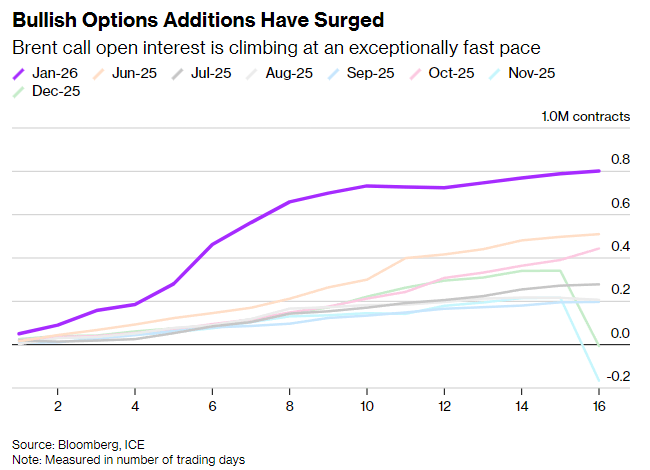 尽管市场正面临供应激增带来的下行压力,但特朗普此番最新威慑仍为油价注入了风险溢价。交易员持续买入看涨期权,为美伊可能爆发的新冲突对冲风险,这一做多态势的持续时长创下约14个月以来的新高。