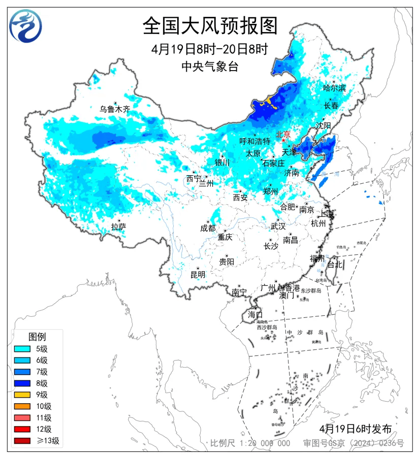 4月19日,中国气象局启动重大气象灾害(大风、强对流)四级应急响应。中央气象台发布强对流天气、沙尘暴蓝色预警、大风、大雾黄色预警。河北、山东、河南等省市部分地区将有10级以上雷暴大风;新疆、内蒙古、河北、河南局地阵风达10级以上;新疆南部、内蒙古中部部分地区有沙尘暴;黄海、辽东半岛、山东半岛等多地将有大雾,能见度不足1公里。请注意防范。