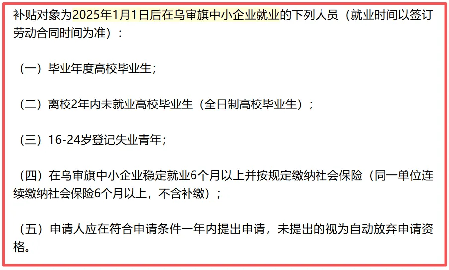 鄂尔多斯市乌审旗社保和就业综合服务中心近日发布大学生在中小企业稳定就业一次性生活补贴申报通知,2025年1月1日后在乌审旗中小企业就业的毕业年度高校毕业生、离校2年内未就业全日制高校毕业生,以及16至24岁登记失业青年,在同一单位稳定就业满6个月、连续缴纳社保(不含补缴),且在符合条件一年内完成申报,即可申领每人3000元一次性生活补贴。