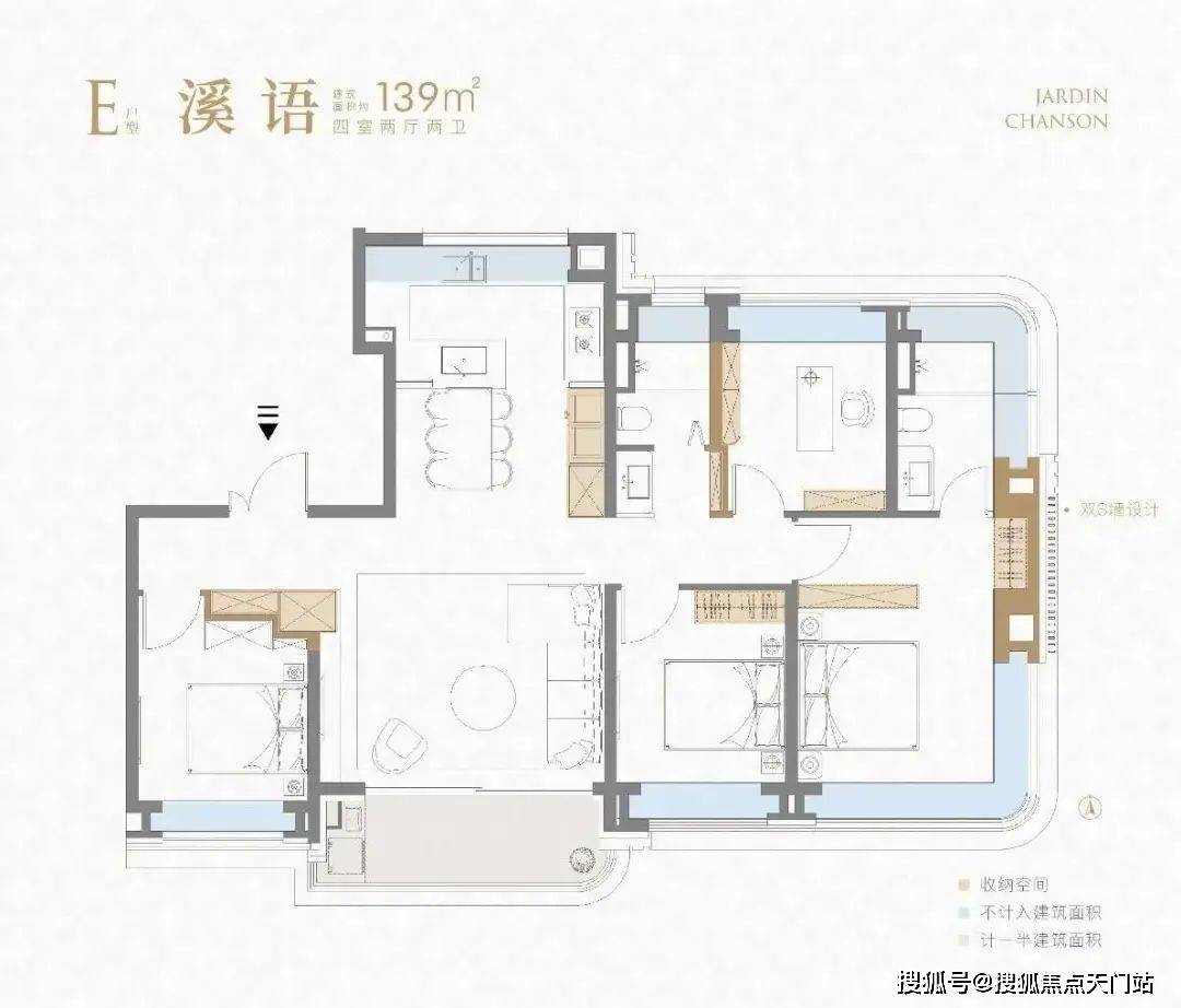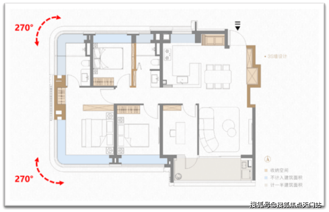 约107㎡边户全屋设计了5个飘窗,而139㎡户型的飘窗总体线m,还不算阳台。飘窗面积折合下来,就是约15平米的赠送面积,价值小100万!