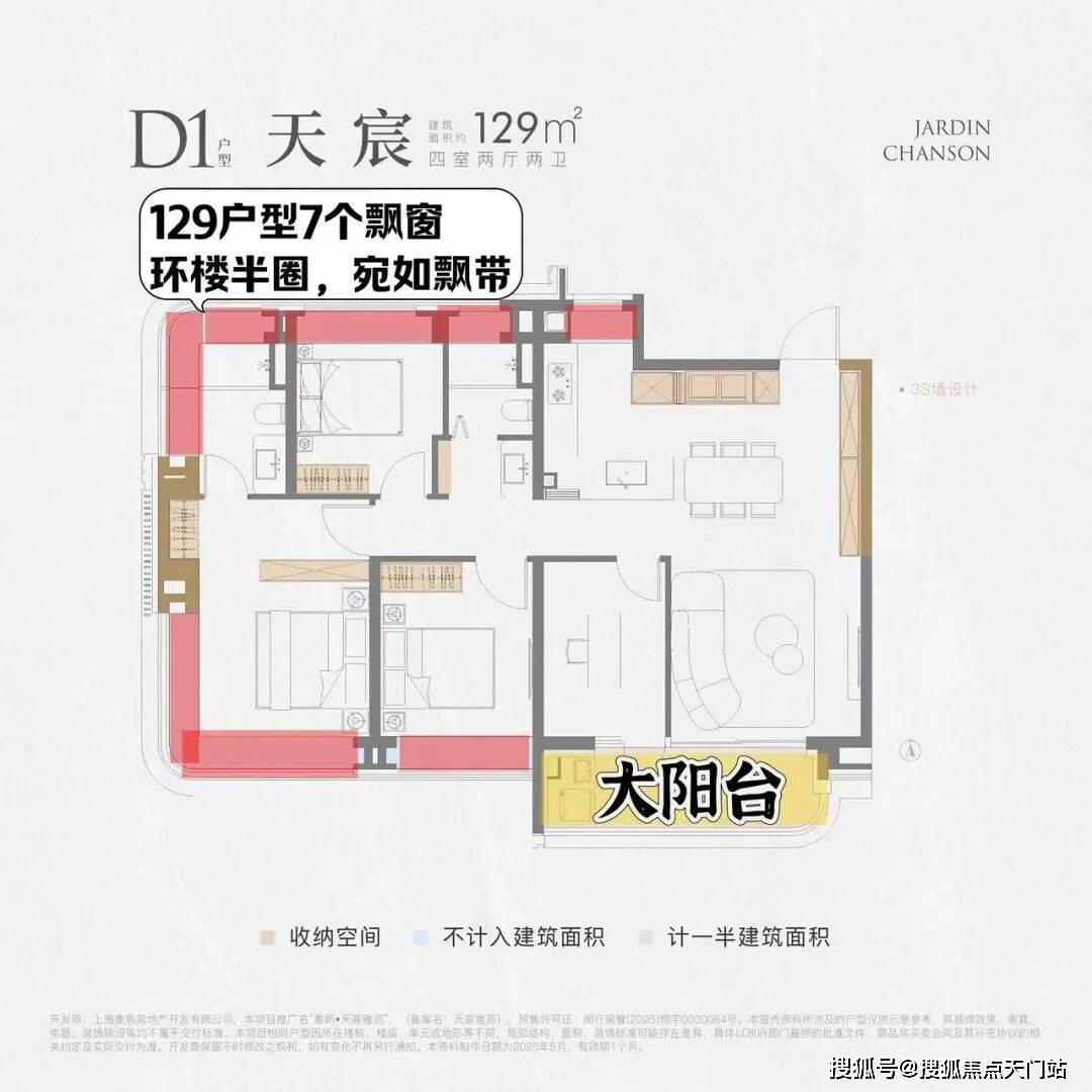 “不是飘窗,更像是飘带。”采光周长惊人,以129㎡户型为例,7个飘窗,环楼超半圈,宛若飘带。