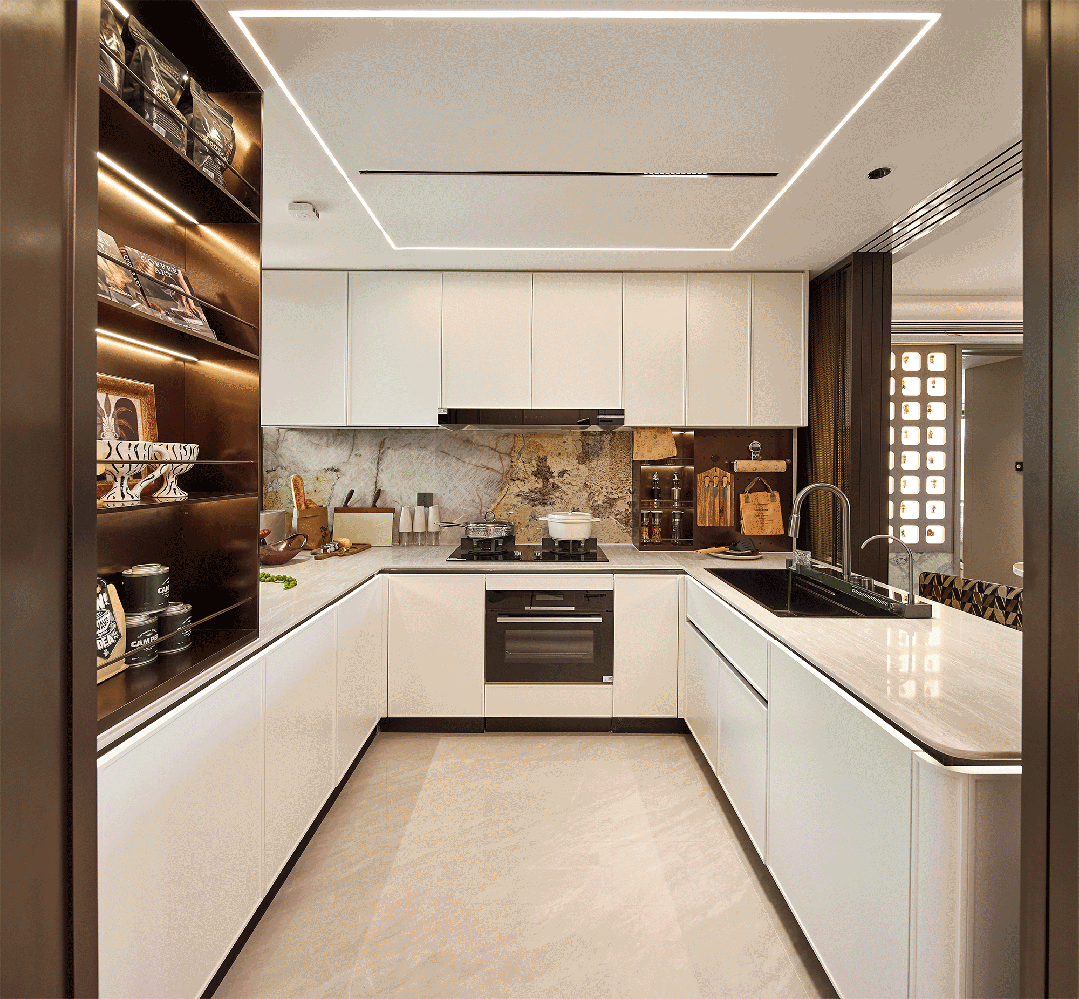 、高柜顶部一窥到底的镜面反光膜、大大提高空间利用的薄抽,不用弯腰一踢即开的踢脚抽设计,便利性大大增加;部分户型厨房台面还做了高低台设计