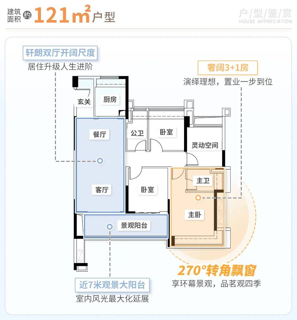 建面约121㎡进阶四房,片区罕有的7米阔景阳台,进深超2米延伸景观面,生活的质感从进家门起便缓缓铺开。
