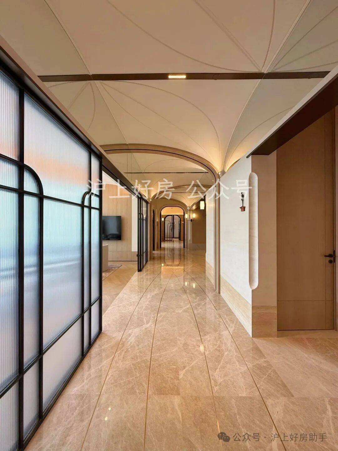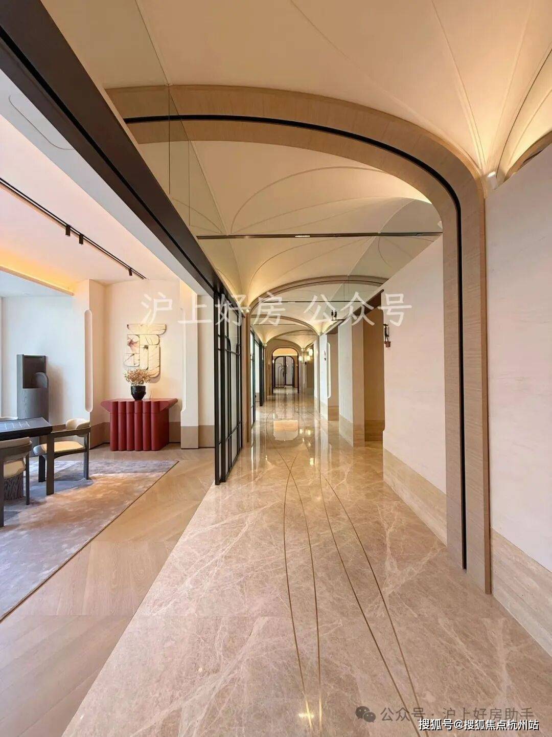 外滩瑞府的2号楼泛会所,正是华润置地深入洞察这份需求后,给出的精准回应。空间由汤臣一品、翠湖六期同款设计师渡边智昭先生操刀,实际呈现的质感不仅还原了设计师的蓝图,更带来超出预期的惊喜。整体空间中,艺术廊道深度融合外滩历史文脉,顶部石材切割出流畅的圆弧转角,与地面弧形线条相互呼应,